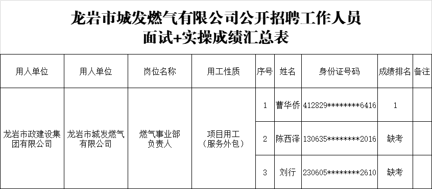 龍巖市政建設(shè)集團(tuán)有限公司公開招聘工作人員面試+實操成績排名的公示